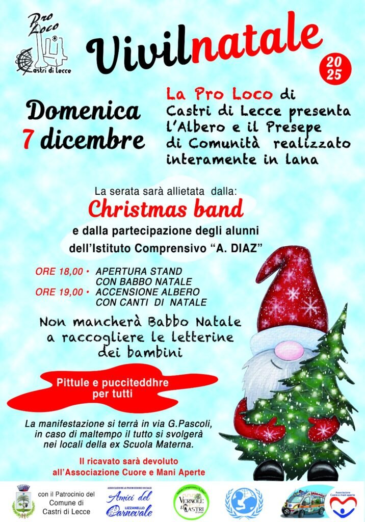 Domenica 7 dicembre, Castri di Lecce si prepara a vivere il Natale con un evento speciale in via Pascoli. La Pro Loco, attraverso l’iniziativa “Vivilnatale”, presenta l’Albero e il Presepe di Comunità, un’opera realizzata interamente in lana da cinquanta donne del paese, che hanno dedicato due mesi di lavoro a questo progetto. L’albero di Natale, […]